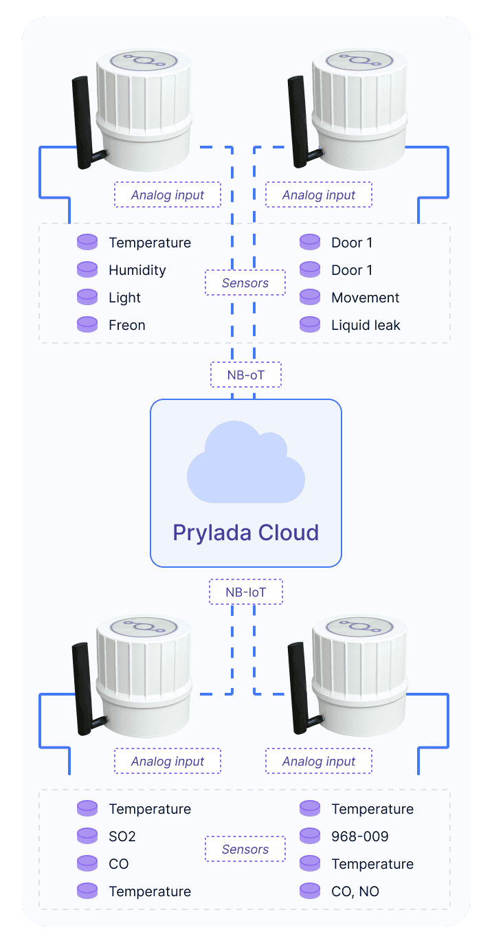 Prylada is a complex solution with the modular design: hardware, firmware, and software modules. The modular approach along with the popular communication interfaces of Prylada simplifies the implementation process and makes the network easily scalable.